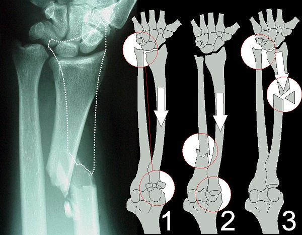 Monteggia fracture-dislocation (2), and Galeazzi fracture-dislocation (left