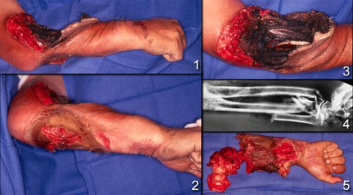 to the obvious wounds at the elbow level, all distal structures were crushed