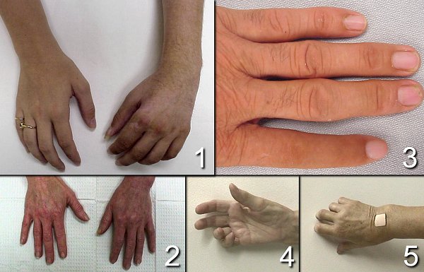 affected (1,2), less commonly a single digit (3). Dupuytren's type
