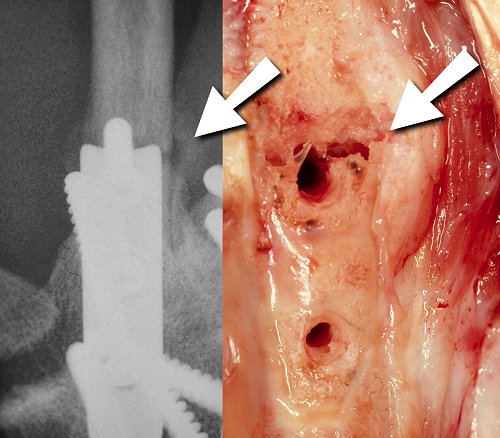 Figure Legend: Pathologic metacarpal fracture through the distal screw hole of a wrist fusion plate which acted as a stress riser.