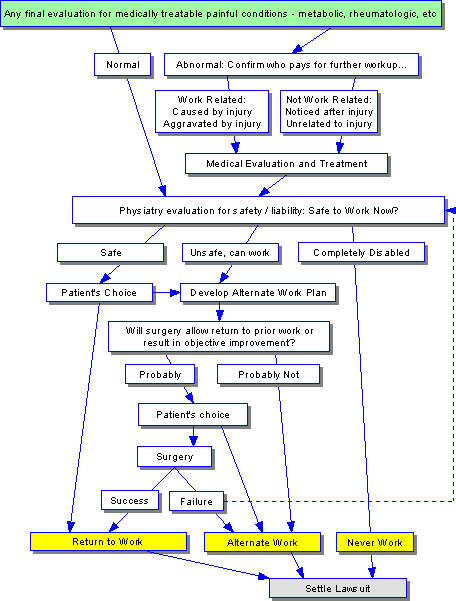 Goals are to avoid prolonged time off work, avoid subjecting the patient to unnecessary or unhelpful tests, surgery or other treatment. In some cases, persistent symptoms must simply be accepted.