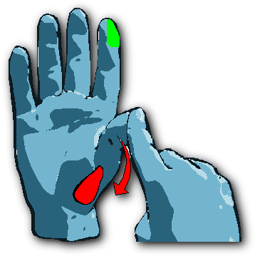 Fig. 1b. Quick survey. Nerve function may be quickly surveyed by checking the unique sensory islands muscle uniquely innervated by the median, ulnar, and radial nerves. The sensory island of the median nerve is the radial tip of the index finger, and an easily tested unique muscle innervation is the abductor pollicis brevis. |