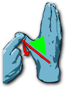 Fig. 1b. Quick survey. Nerve function may be quickly surveyed by checking the unique sensory islands muscle uniquely innervated by the median, ulnar, and radial nerves. The sensory island of the radial nerve is the dorsal first web space, and an easily tested unique muscle innervation is the extensor pollicis longus. |