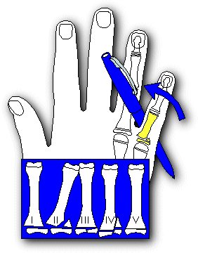 Fig. 6. Salter fractures. With the diagram arranged in this order, a helpful mnemonic is S A L T E R: the fracture line is I - the Same as the growth plate, II - Above the growth plate, III - Lower than the growth plate, IV - Through the growth plate, and V - Epiphyseal crush: Remember! The common Salter II fracture of the base of the proximal phalanx with deviation toward the border of the hand may be reduced with a local block and a pen or pencil as a fulcrum in the web space. |
