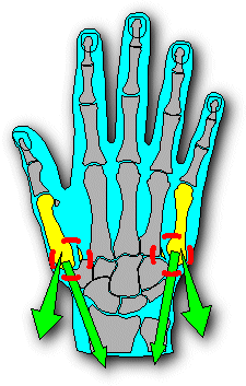 Fig. 8. Bennett's and reversed Bennett's fractures. These similar injuries are carpometacarpal joint fracture dislocations. In the thumb (Bennett's), the abductor pollicis longus acts as a distracting force, producing subluxation and proximal migration. In the small finger (reversed Bennett's), the extensor carpi ulnaris acts in the same fashion. |