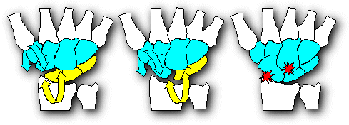 Fig. 9a. SLAC / SNAC wrist. Both scaphoid fractures and scapholunate ligament tears allow independent motion of two mechanical sections which are ordinarily linked. If not corrected, this changes joint tracking, introduces incongruity and in time results in degenerative changes at the radioscaphoid, capitolunate and then remaining joints, referred to either as ScaphoLunate Advanced Collapse (SLAC wrist) or Scaphoid Nonunion Advanced Collapse (SNAC wrist). |