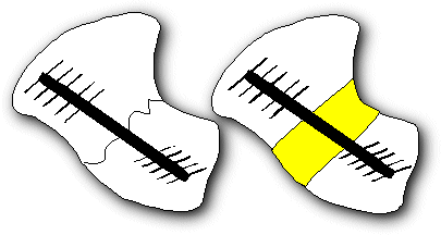 Fig. 9b. Herbert screw fixation of scaphoid fractures. The leading and trailing threads of the Herbert screw are set to different pitches, leading to interfragmentary compression as the screw is advanced, either in a fresh fracture (left) or across an intercalated bone graft (right). |