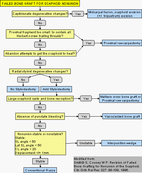 Fig. 10a. Algorithm for management of failed scaphoid graft. Much more than the acute situation, considerations weigh the condition of the adjacent joints and the possibility of salvage operations.