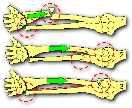 Fig. 13. Combined forearm fractures. (1.) Galeazzi fracture dislocation: radial shaft fracture with dislocation of the distal radioulnar joint. (2.) Monteggia fracture dislocation: ulnar shaft fracture with dislocation of the radial head. (3.) Essex Lopresti lesion: proximal radial fracture, disruption of the interosseous membrane, disruption of the distal radioulnar joint. |