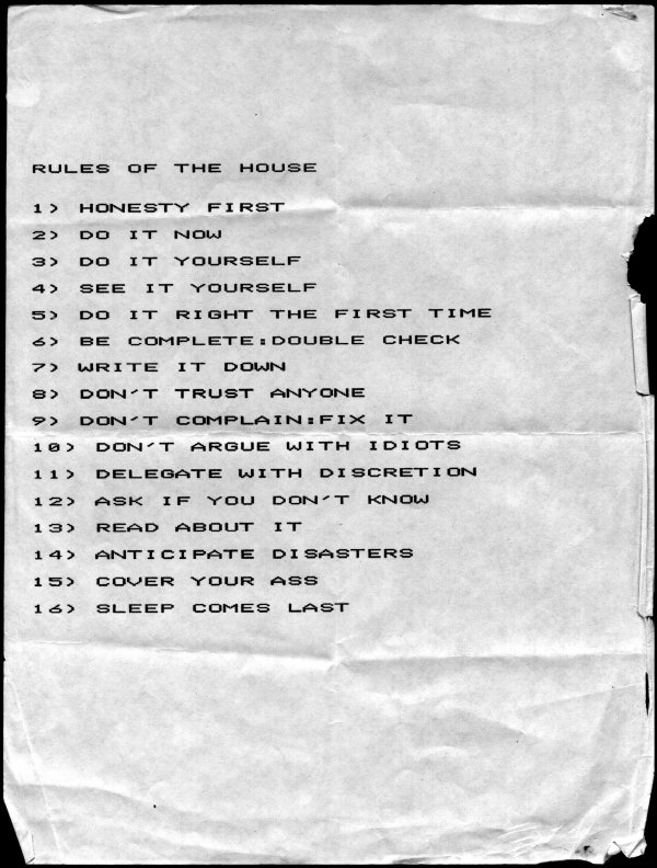 Some of these rules originated in July 1983. At the time, Dr. Chris Weiss and I were the two 4th year general surgery residents covering the trauma service at Boston City Hospital, the rotation starting July 1. The two of us were discussing our job of transforming the formless new recruits into the kind of battle hardened machines that we had become, he just came out with "Do it now... Do it right the first time... Do it yourself...". I was really taken by the power and simplicity of that, and being a compulsive list maker, I decided to make a litmus test for the proper code of conduct for residents on the trauma service, one that would shine through chaos, be remembered despite exhaustion, and follow the black and white / right and wrong mentality of the service at the time. He and I worked in a few more concepts, and then I wrote the rules on an oversized piece of paper and taped this to the wall of the "trauma suite" - our rough living quarters where we lived like squatters, in an abandoned wing of the old Dowling surgical building of Boston City Hospital. Incredibly, I have found an old picture taken of this first version. This picture is the wall of our quarters in the hospital, probably taken in August 1983: