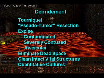 Debridement of severe wounds is an exercise in applied anatomy, best performed in the style of tumor surgery, removing the zone of injury, while preserving vital structures. Following sharp debridement, cultures are obtained and then lavage may be instituted. |