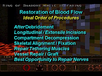 Revascularization is the most urgent step, but should follow steps requiring tourniquet. There is much greater blood loss when debridement follows revascularization. Vein grafts may become redundant and require revision when placed before muscle repairs. It is always more risky to "come back later" to do nerve repairs adjacent to a prior vascular anastomosis. |