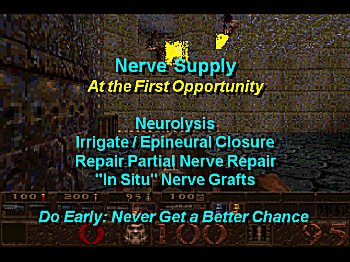 Nerve reconstruction is most reliably done early. During debridement, sections of nerves which appear devascularized but clean may be left in situ as long as they are provided a vascularized soft tissue cover.