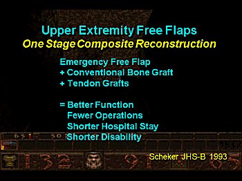 One final note - on timing of wound closure and function. Sheker reported on immediate reconstruction for complex wounds, using one stage soft tissue and tendon reconstruction, tunneling extensor tendon grafts through the subcutaneous tissue of the flap at the time of transfer. In addition to favorable healing, function was improved compared to reconstruction with conventional staged extensor tendon grafting. |